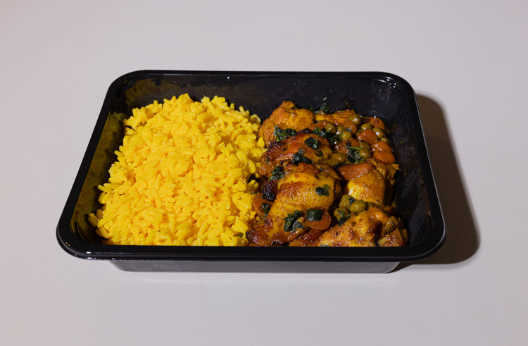 Kip, kippenbouillon (water, ui, wortel, selderij), rijst, kurkuma, knoflook, gember, laurier, peper, zout, olie