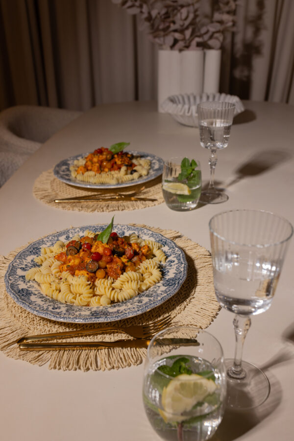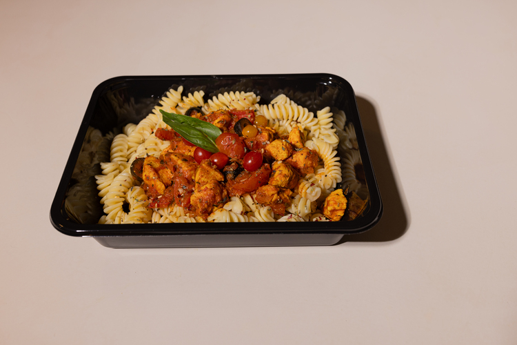 Fusilli pasta gemengd met stukjes kip en kleurrijke groenten in een kruidige tomatensaus of romige saus. Lekker en goed vullend.